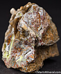 which is also fluorescent. Small red flecks of Cinnabar are also present. The Karpatite is present both beneath the drusy Quartz and