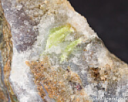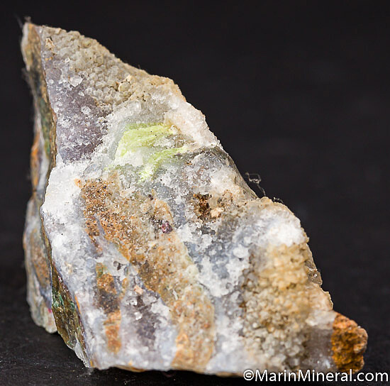 Silica rich matrix hosting drusy Quartz and numerous areas of bright yellow Karpatite. Karpatite is an uncommon organic mineral, which is also fluorescent. Small red flecks of Cinnabar are also present. The Karpatite is present both beneath the drusy Quartz and exposed on many areas of the specimen.