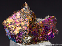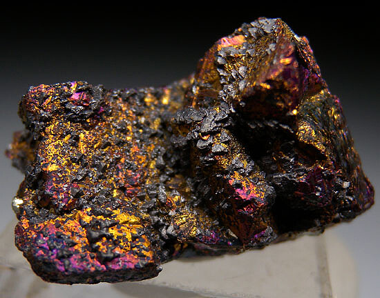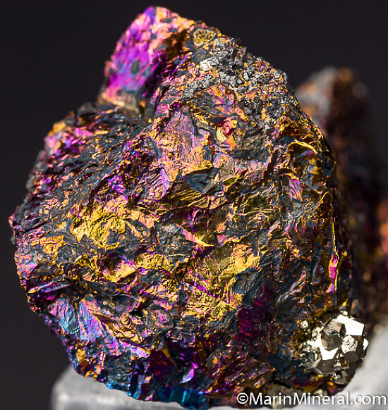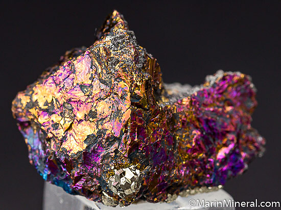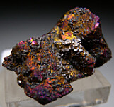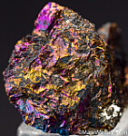Bright, irridescent specimen of Bornite from the famous Butte mining district in Montana. Very colorful all around with flashes of gold and purple. There are broken surfaces but also good crystallized surfaces. There are small micro metallic rystals of another species on the crystallized faces of the Bornite.