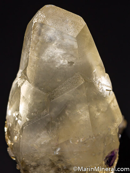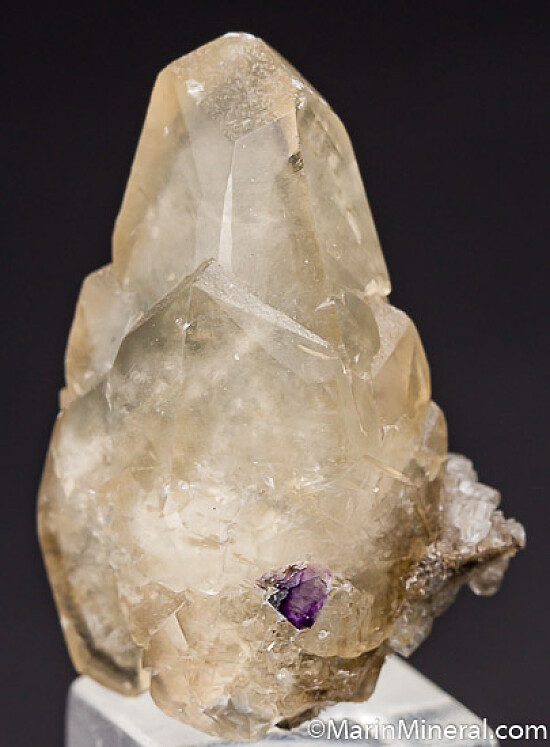 Complete single crystal good all around and partially double-terminated, with a small bit of purple Fluorite attached. Fine quality Calcite crystal out of an old thumbnail collection. Valued at $150.