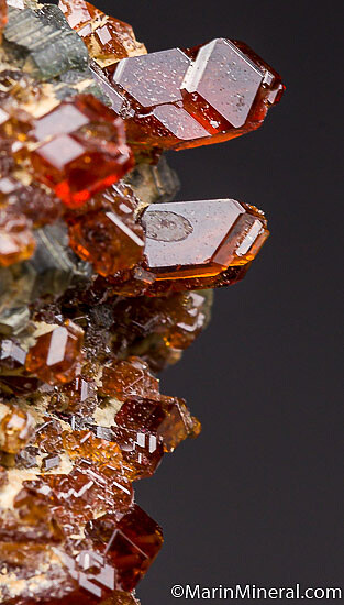 Bright red Grossular crystal among books of Clinochlore. The Grossular have the elongated form this region is known for.