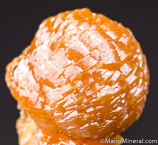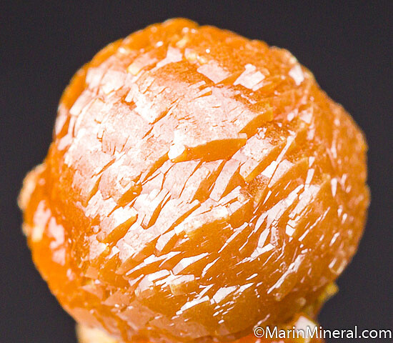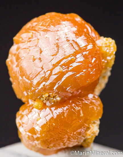 Nearly complete 1.1cm sphere of arsenian Pyromorphite atop a smaller partial sphere.