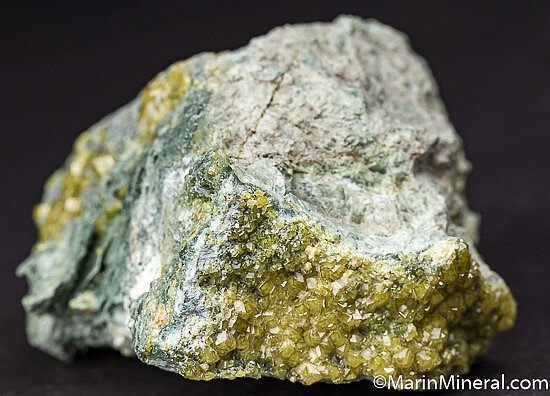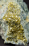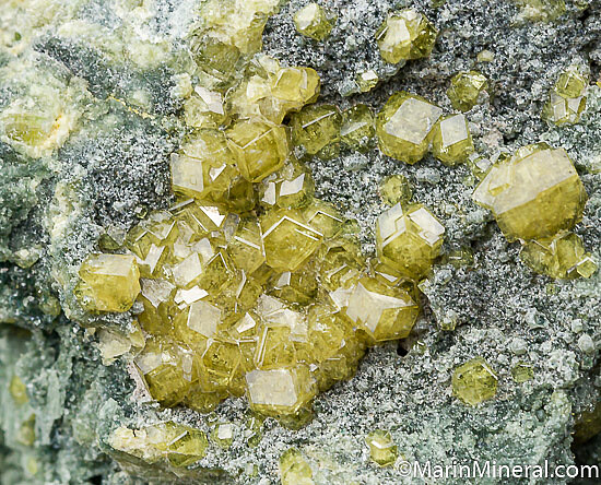 Green Andradite garnet var. Demantoid crystals to 3mm covering a number of surfaces of serpentinite matrix. Good bright, lustrous crystals.