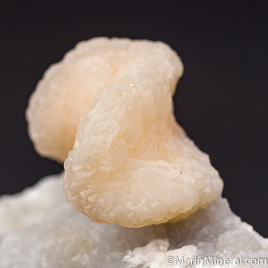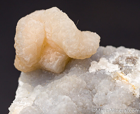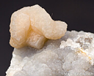 Smithsonite replacing Dolomite, with the curving form of the former Dolomite crystal clearly evident. The surface of the matrix is also covered by a layer of velvety Smithsonite. This one in not the yellow color that the mine is best known for, but the large, isolated wavy crystal is spectacular and 1.7cm wide.