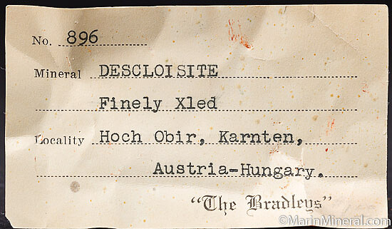 Quartz matrix covered on multiple sides with small brown Descloizite crystals. Neat locality piece that comes with an old 'The Bradleys' label.