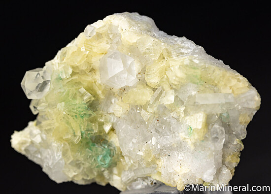 Fine quality specimen Ankerite, a mineral similar to Dolomite, with Quartz crystals and green Mariposite. Mariposite is a dolomitic marble included by chromium rich mica found in the foothills of California and was often an indicator of nearby Gold.
