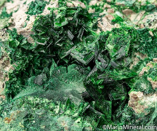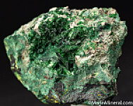 Open vug filled with fibrous Malachite and large platy crystals of Torbernite. Other minerals present throughout the matrix.
