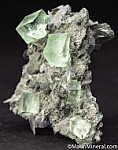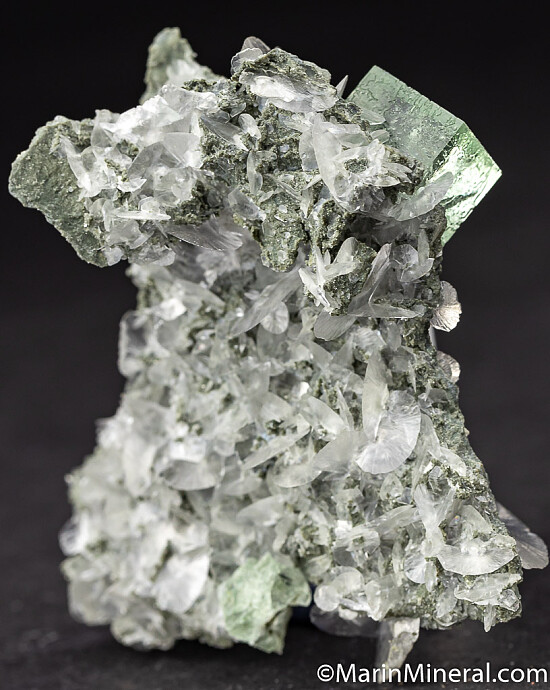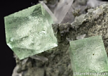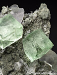 Transparent light green Fluorite cubes with transparent wafer-like Calcite crystals. The quality of both the Fluorite and Calcite is remarkable. The best of a small lot I obtained years ago.