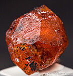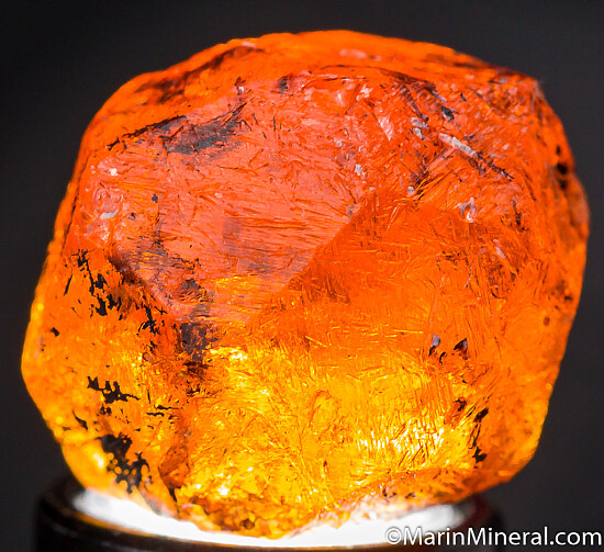 Complete 'citrus' orange Spessartine crystal from old finds in Tanzania. These were mostly found as partial or damaged crystals with perfect complete crystals such as this much less common. Equant form with no significant damage - I found a single 1mm nick on the whole crystal. There are some black Braunite inclusions, but not much as alot of the darkness is staining on the surface that can be removed. Good crystal!