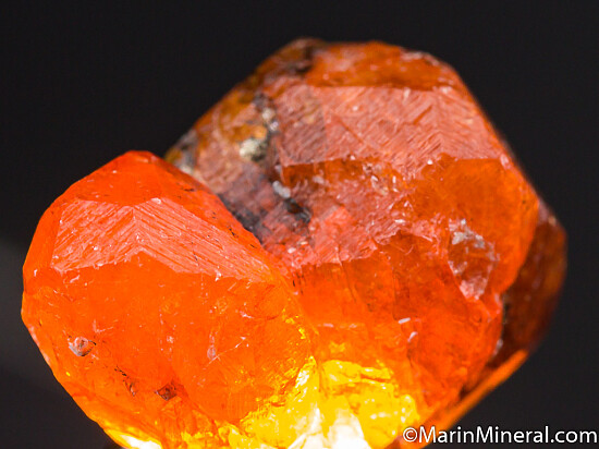 Complete 'citrus' orange Spessartine crystal group from old finds in Tanzania. These were mostly found as partial or damaged single crystals with perfect complete clusters crystals such as this much less common. It's hard to say how many crystals comprise the grouping because they have grown close together, but there are at least 3. It's also complete all around and undamaged. Translucent to transparent with good color. Nice crystal!