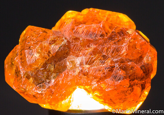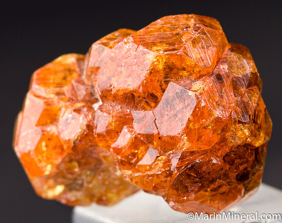 Complete 'citrus' orange Spessartine crystal group from old finds in Tanzania. These were mostly found as partial or damaged single crystals with perfect complete clusters crystals such as this much less common. It's hard to say how many crystals comprise the grouping because they have grown close together, but there are at least 12. It's also complete all around and undamaged. Translucent to transparent with good color. There is an attached group of translucent pink Mica attached to one side. Really nice cluster!!!