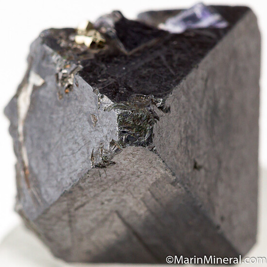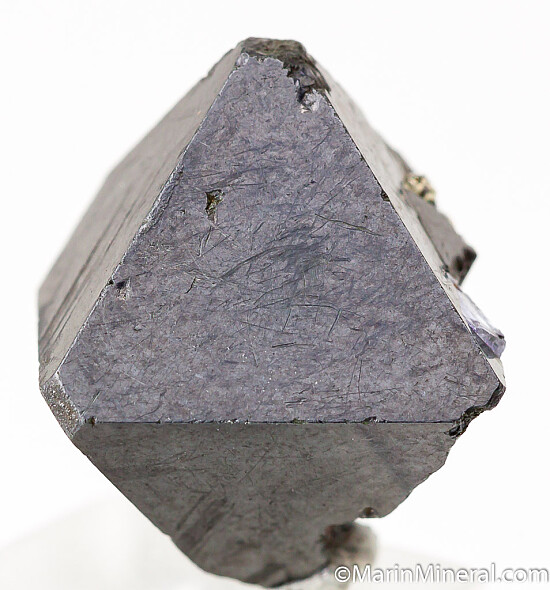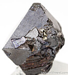 Hard to find thumbnail-sized octahedral Alabandite crystal. Good quality, nearly undamaged with only one small nick. Nearly complete with some grooves and attached Tanzanite, Pyrite, and Calcite on some lower faces, has about as good as luster as you get with these. These are considered by many as the best of species and are certainly the largest ever found.