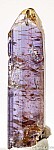 Tall, slender single Tanzanite crystal with excellent luster, transparency. Purple/blue with a yellow zone at the top. It's undamaged (there is a small indentation on one side that looks like a spot where another former crystal grew rather than damage), complete all around, and has a small sphere of white Calcite attached near the base.