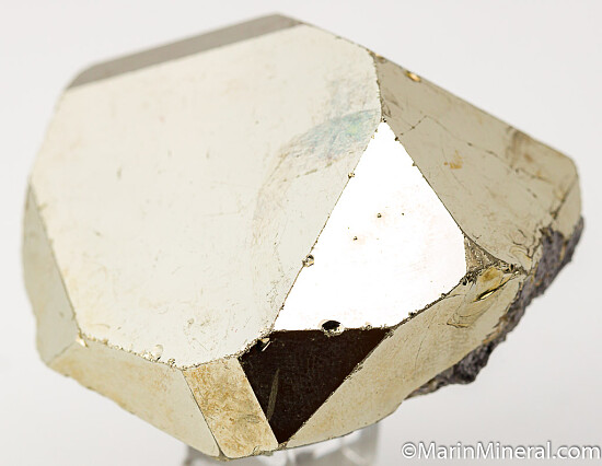 Large, somewhat flat single Pyrite crystal with large, flat faces and incredible luster. The exotic crystal forms and high luster of Merelani Pyrite make it my favorite of any Pyrite found. This is a good example atop a small amount of Calcite and Graphite.