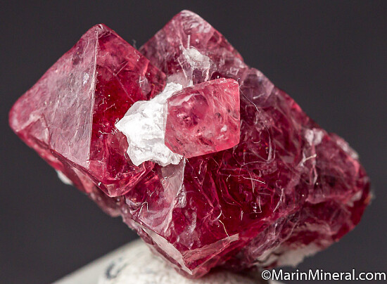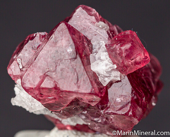 Intergrown cluster of 4 red/pink Spinels. Spinel from Mahenge is world famous for incredible faceted gemstones and much of what is found is used for gems. This is good cluster of octahedral crystals with just a small amount of chipping. Largest crystal is 1.8cm.