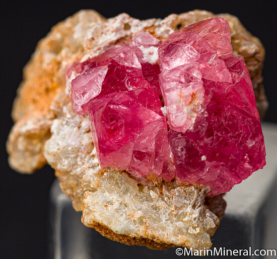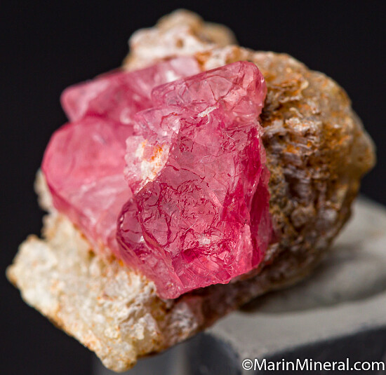 Spinel on Calcite from 2019 finds at Mahenge. The Spinel is a good pink and translucent to transparent - you could cut a small stone from the crystal. Slight chipping otherwise undamaged.