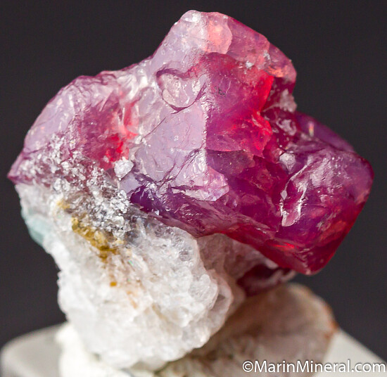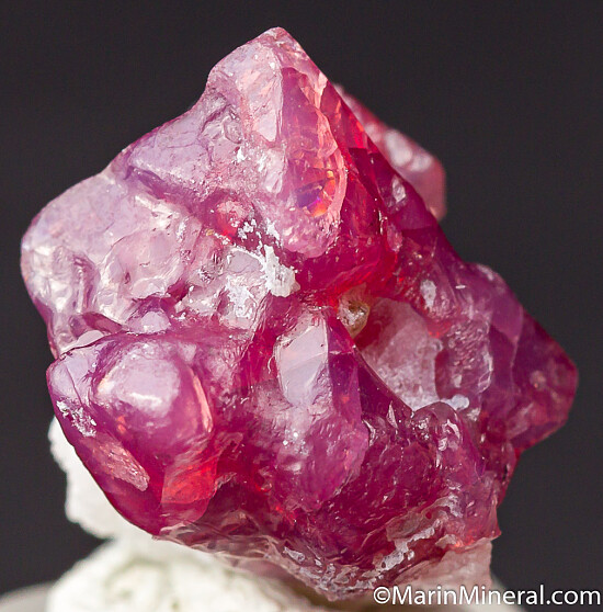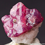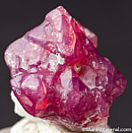 Spinel on white Calcite from 2019 finds at Mahenge. The Spinel is purple/pink and translucent. Undamaged with natural dimpled surface growth patterns. Good crystal valued at $250.
