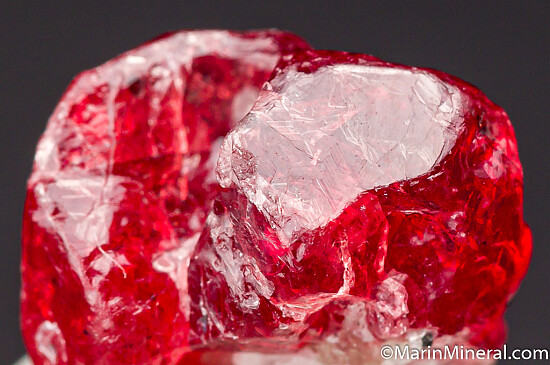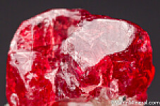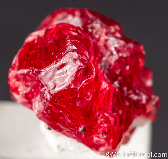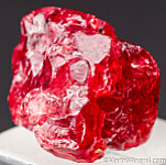 Single red Spinel crystal from recent finds in Mahenge. Undamaged crystal with typical irregular growth on a small bit of white calcite. It's complete all around and undamaged. Good luster and gemmy!!! Good crystal with great color valued at $150+.