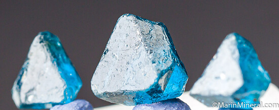 Lot of 3 Spinel-twinned crystals. Slight edge/tip damage, but overall very good. These were first discovered in 2001 and are found mostly of industrial quality. Though they don't get very large, the color is spectacular. Very good color and transparent (I have noticed that the spinel-twins have the best transparency). Studies have shown these to be very high in Zinc and could be labelled as Gahnite.