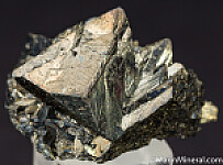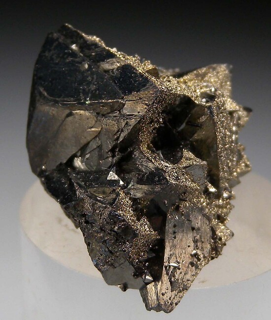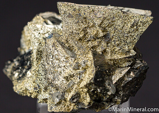 Cluster of Tetrahedrite crystals with coatings of Pyrite on select faces. Crystals reach 1.8cm on edge.