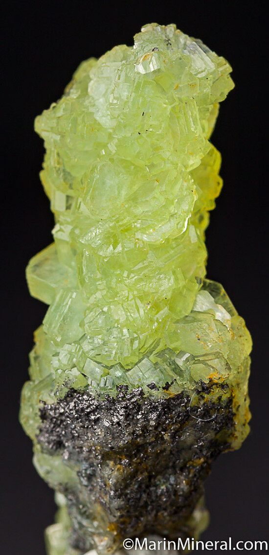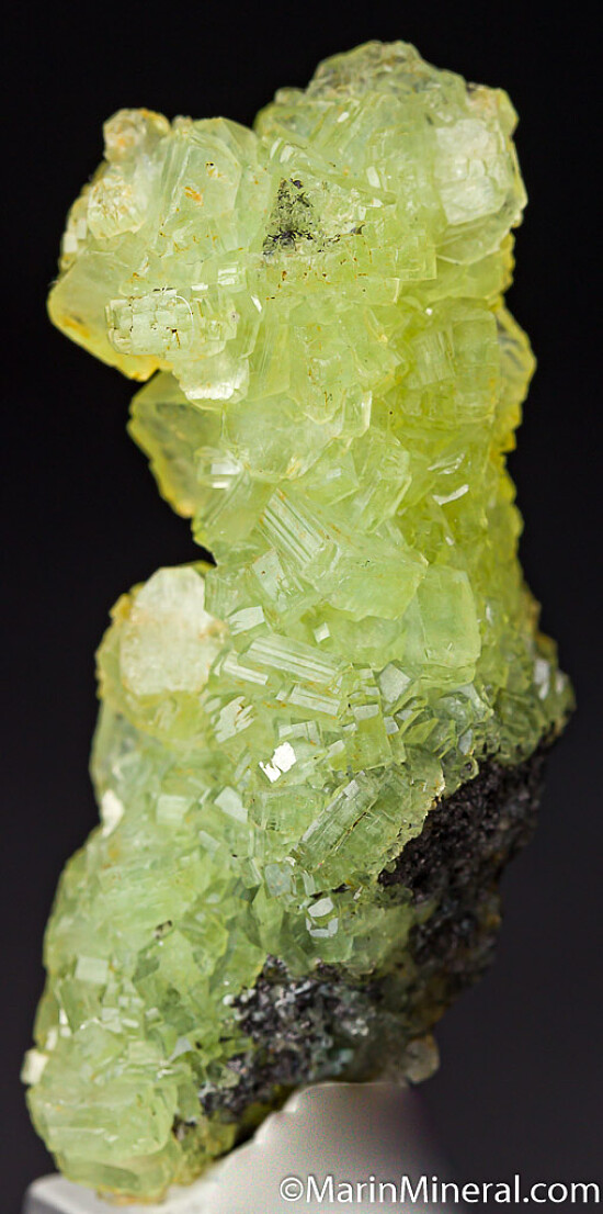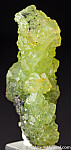Unusual stalctitic formation of translucent Prehnite crystals. Good yellow color and crystallized all around. This specimen is solid Prehnite with some attached Graphite at the base. Valued at $250.