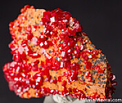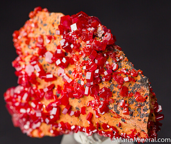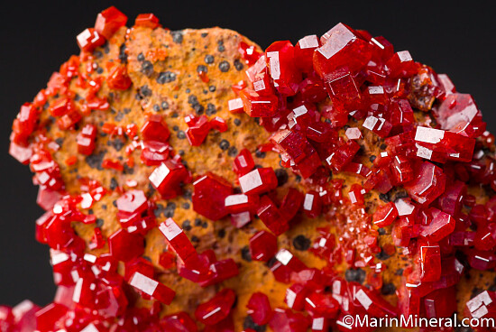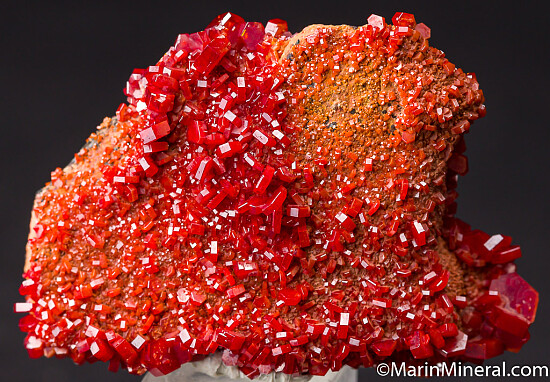 Bright, lustrous red Vanadinite crystals that contrast well against the brown rock matrix. A floater with crystals on all sides.