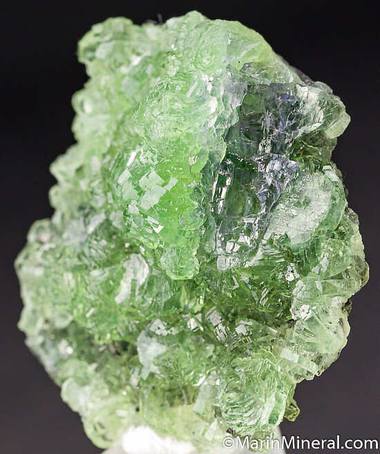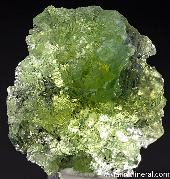 Relatively flat, round cluster of translucent yellow Prehnite. Crystallized all around, even the backside, and undamaged with a small contact along part of the edge. There is a partial crystal of blue Tanzanite includes on the side of the mound-shaped mass of crystals. Good, distinct crystals.