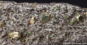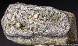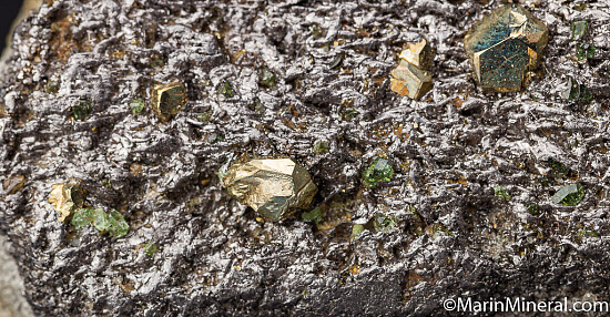 Lustrous, brassy Pyrite crystals mixed with green Tsavorite crystals on a matrix of Graphite crystals.