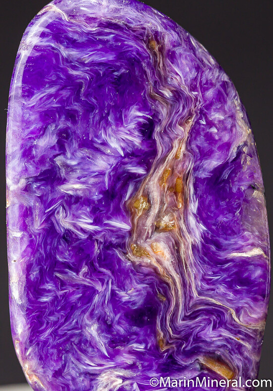 Polished specimen of Charoite, a rare and colorful silicate mineral first described in the 1970s and known only from Yakutia.