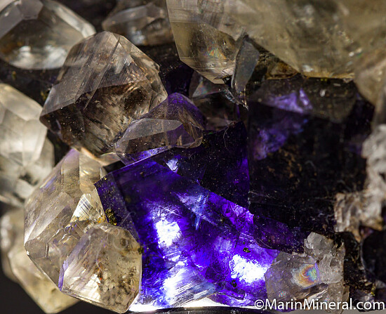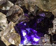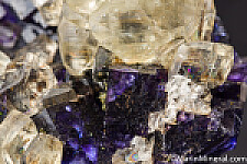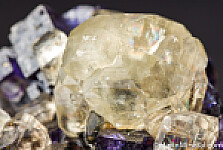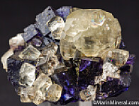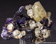 Calcite crystals to 2.5cm on translucent purple cubes of Fluorite. The smaller Calcites are like gems, and aside from a couple incomplete crystals on the edge, are all undamaged. This is an old piece I've owned for about 45 years.