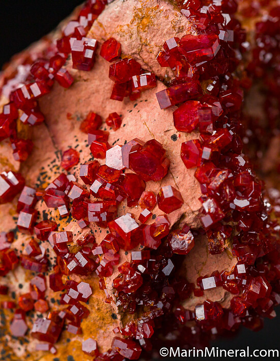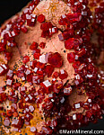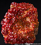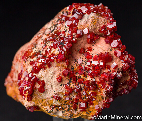 Tan matrix covered on the top and sides by bright, lustrous Vanandinite crystals. On most Moroccan Vanadinite specimens, individual crystals will have a good side and a bad side that are dull with a brown coating or alteration. On this specimen the crytals are all good - bright red and lustrous on all sides!