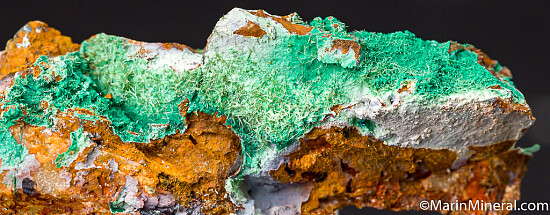 Fine needle-like crystals of Olivenite scattered across Malachite on matrix.