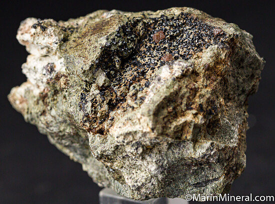 Black Andradite crystals var. Melanite in vugs in matrix. The largest vug is lined with Malanite and also has 3 pink Perovskite crystals to 3mm in size.