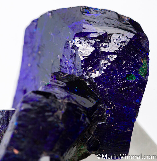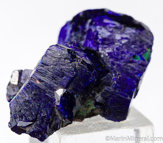 Cluster of deep blue Azurite crystals with a minor amount of Malachite. This is from what is called the Watercourse Pocket of the mine which produced some of the best specimens ever found there. Complete all around and undamaged except for very minor edge wear. Main crystal is 2cm in longest dimension. Very nice example valued at $150.