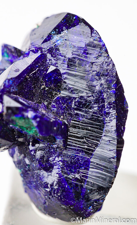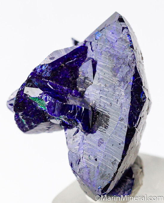 Cluster of deep blue Azurite crystals with a minor amount of Malachite. This is from what is called the Watercourse Pocket of the mine which produced some of the best specimens ever found there. Specimens from this pocket were composed of interlocking, lustrous crystals. Many were detached floaters and most had small needle-like crystals of Malachite attached to one side. This specimen is a floater with a 2.3cm double-terminated crystal.