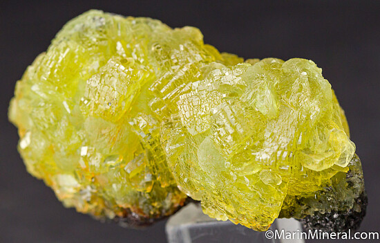Two interconnected spheres of luscious yellow Prehnite with a small amount of attached Graphite. Highly translucent with large crystals. A great example of the high quality Prehnite that has been found in the past couple years at the Merelani Tanzanite mines. Undamaged, valued at $350.