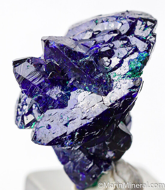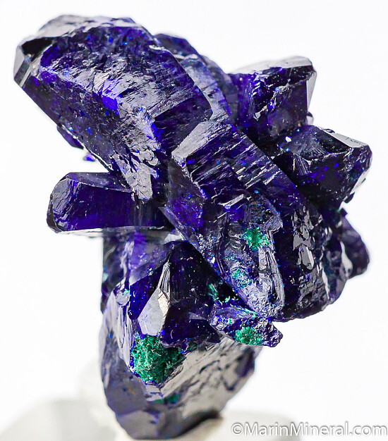 Cluster of deep blue Azurite crystals with a minor amount of Malachite. This is from what is called the Watercourse Pocket of the mine which produced some of the best specimens ever found there. Specimens from this pocket were composed of interlocking, lustrous crystals. Many were detached floaters and most had small needle-like crystals of Malachite attached to one side. This specimen is a floater crystallized all around and nearly undamaged with one of the lesser crystal broken at one end. But even that crystal is neat because it shows the Malachite interior that gives these crystals the bright blue coloration.