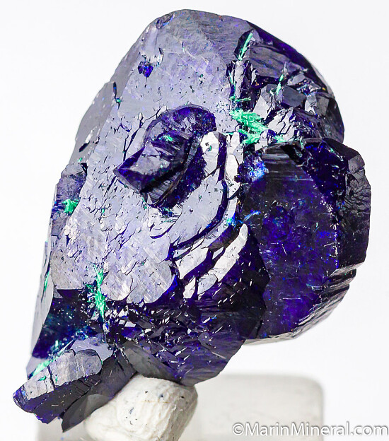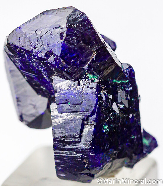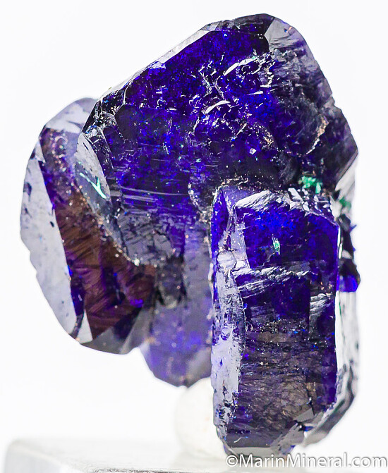 Cluster of deep blue Azurite crystals with a minor amount of Malachite. This is from what is called the Watercourse Pocket of the mine which produced some of the best specimens ever found there. Complete all around and undamaged cluster of multiple crystals, a near floater with just a couple tiny contancts. Main crystal is 1.9cm tall. Very nice example valued at $150.