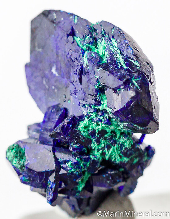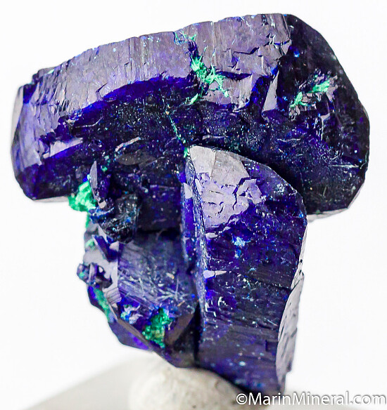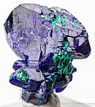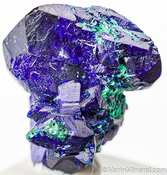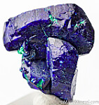 Cluster of deep blue Azurite crystals with a minor amount of Malachite. This is from what is called the Watercourse Pocket of the mine which produced some of the best specimens ever found there. Complete all around and undamaged cluster of multiple crystals, a floater. Main crystal is 1.7cm wide. Very nice example valued at $90.