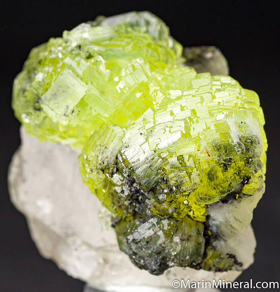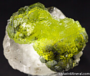Radial clusters of bright lemon yellow Prehnite grown atop the flat surface of a partial Quartz crystal. Lustrous Prehnite with great color and the only one I have with Prehnite on a Quartz crystal.