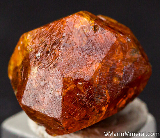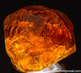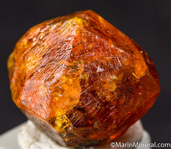 Equant to slightly oval, complete orange Spessartine with good translucency and large areas of internal transparency. This is a complete crystal all around with no contacts - only a small minority of the find are complete crystals, most are shards or have contacts on at least 1 or two sides. There is a small area of overgrowth but no damage. Some areas of black inclusions but many areas of gem, bright citrus orange. Weighs 53 carats.