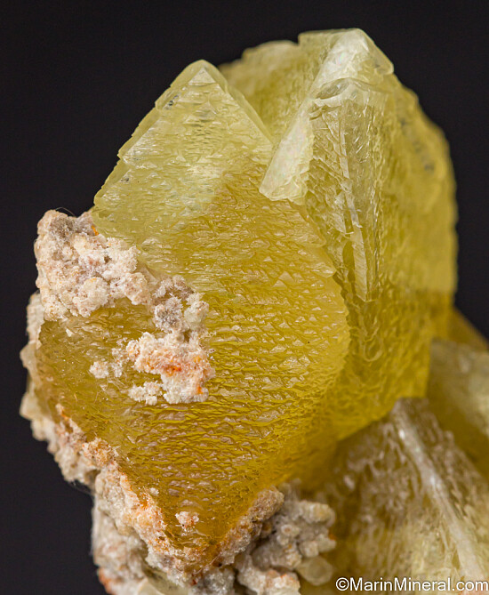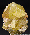 Yellow diamond shaped crystal characteristic for this locality. There are five good crystals on top to 2.7cm long, with a large 3.7cm double-terminated crystal forming the base. There is one cleavage on the right side, otherwise perfect all around.