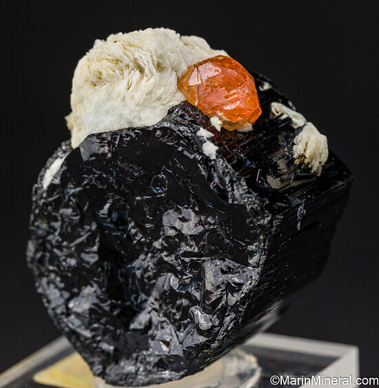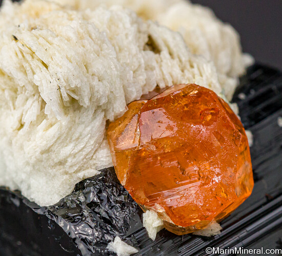 Citrus orange 9mm Spessartine with Albite attached to a segment of black Tourmaline. A hard to find California classic.