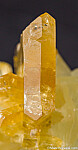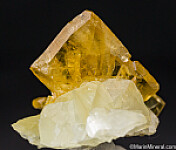 A 3.5cm deep yellow Barite crystal that stands up on edge atop white Calcite crystals.Exquisite, fine quality specimen.