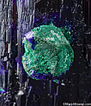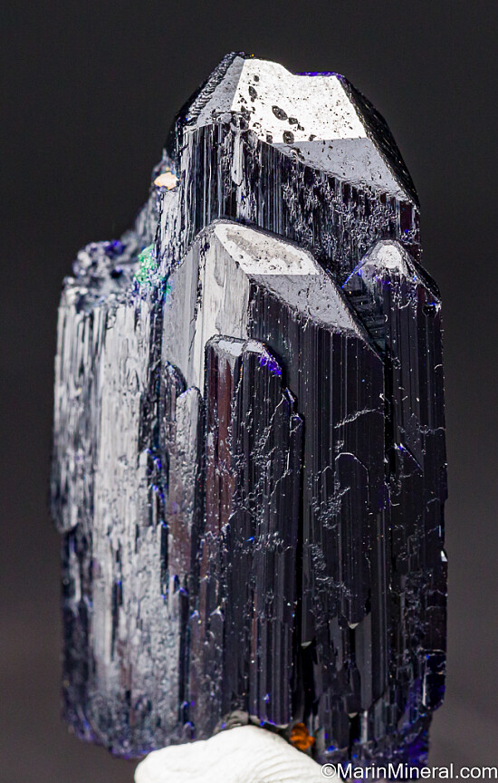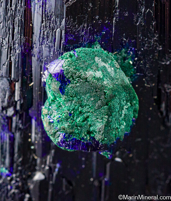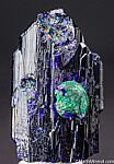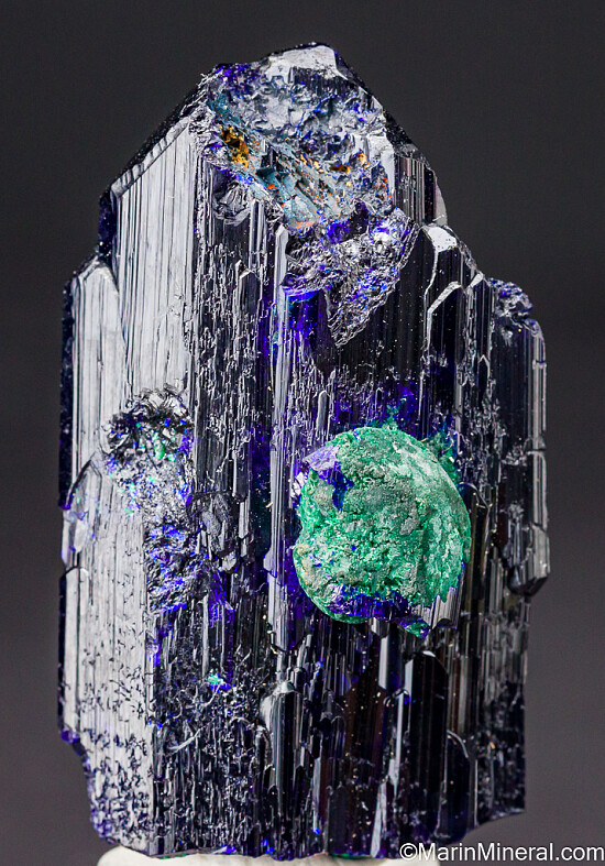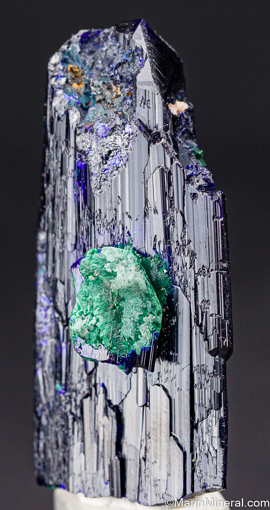 Large single Azurite crystal with a small attached crystal that is altering to Malachite. There is also some alteration to Malachite under the surface of the main crystal that gives areas of 'electric' blue color. Fully terminated and complete all around. There is one chipped area on the side with the small attached crystal (though most of what you see in the third photo is natural etched growth), otherwise it's undamaged. Comes with an old Geary Murdock collection label.