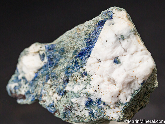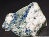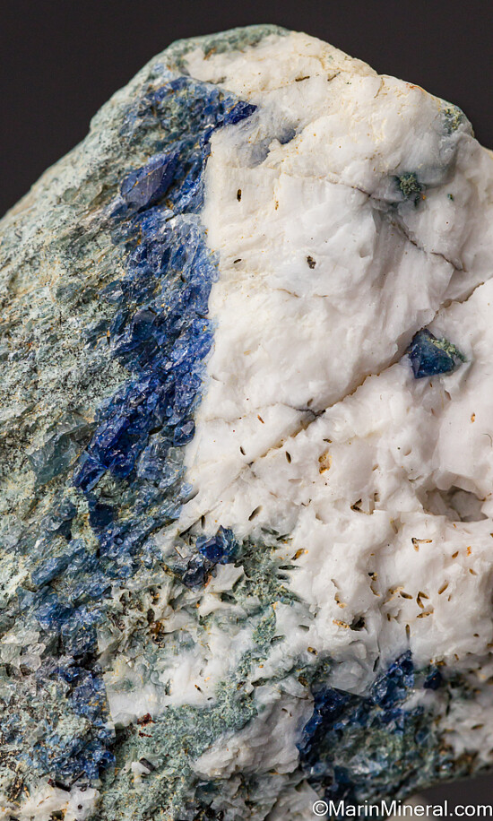 Benitoite crystals and white Natrolite on a schist matrix. Benitoite is a rare gem mineral withthe best specimens found at this now closed mine. Crystals reach 2mm on this specimen and have a great blue color. Small Neptunite crystals are also present.