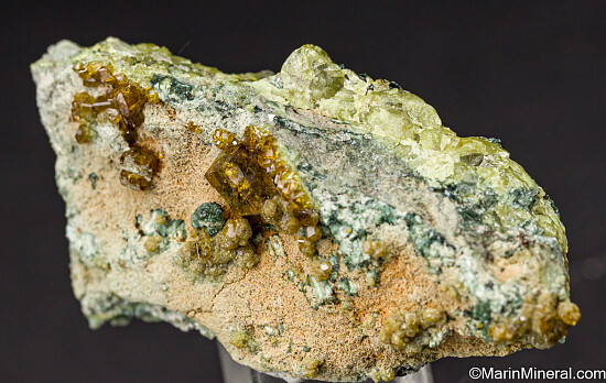 Lustrous golden Topazolite crystals on matrix. Largest crystal is a perfect and well centered 8mm crystal. Ex. Chuck Trantham collection. Collected by Chuck, Al McGuinness, and Leza Junilla in May 1983.
