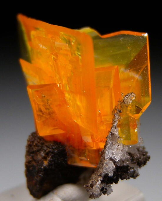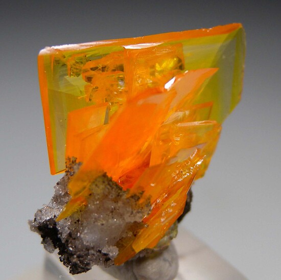 Transparent 'window pane' crystals of orange Wulfenite on matrix. Stunning thumbnail sized Arizona classic, maind crystal is 1.5cm wide.