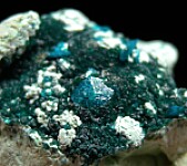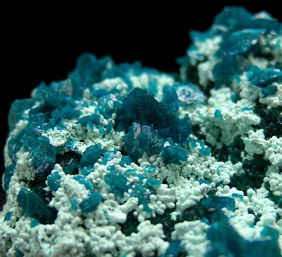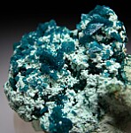 Thick layer of Chrysocolla (?) wrapping around Quartz upon which grow numerous pristine Liroconite crystals. The Liroconite reach 6mm in size and are present on both the top and bottom of specimen and are of the less common blue/green color. From the type locality for the species, likely found in the mid 1800s. Despite it's age and there being dozens (a hundred?) crystals, I can find no damage.