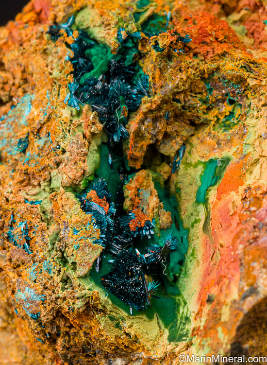 Deep blue crystals of Clinoclase over green Cornubite from the now defunct Majuba Hill Mine. These incredibly sparkly, acicular crystals with deep Navy blue color are characteristic for this area of the mine. Great color and great crystals, valued at $150.